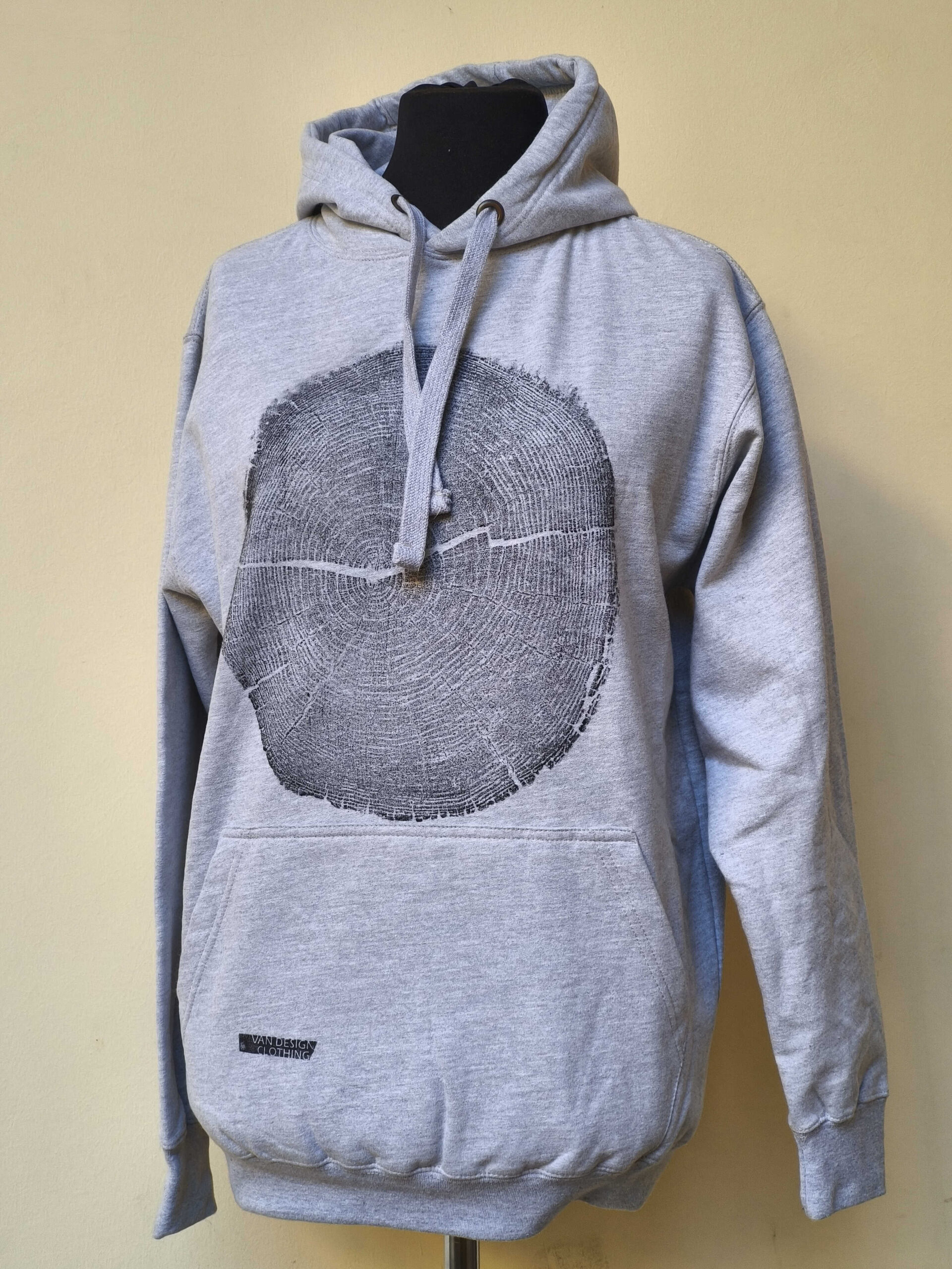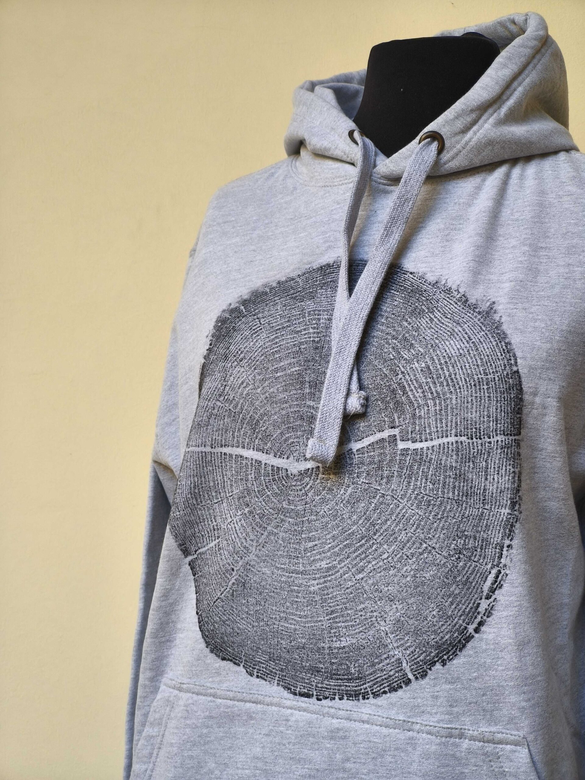 Kézzel-szívvel és vízbázisú szitanyomással készült farönk lenyomat pulóveren.