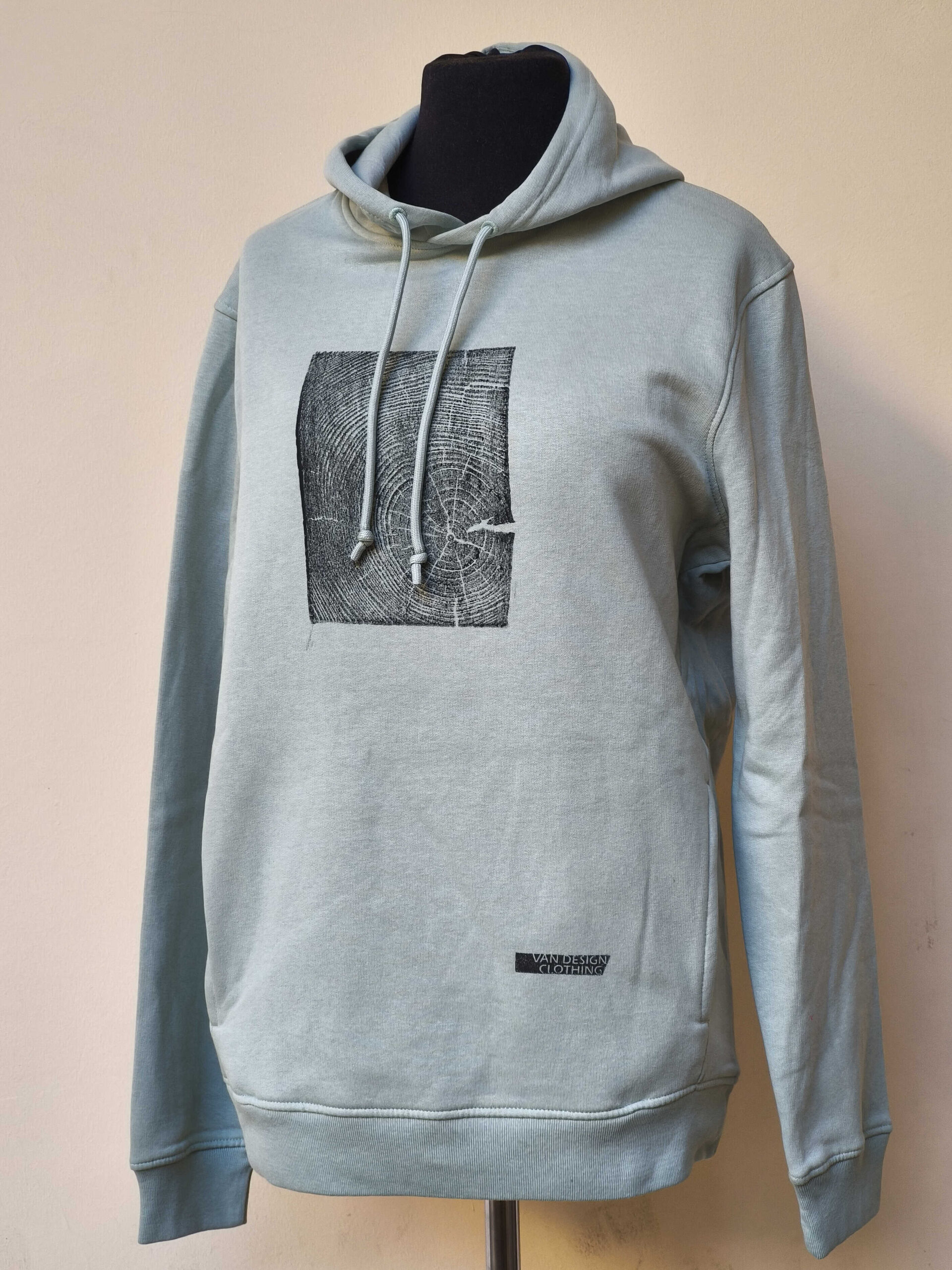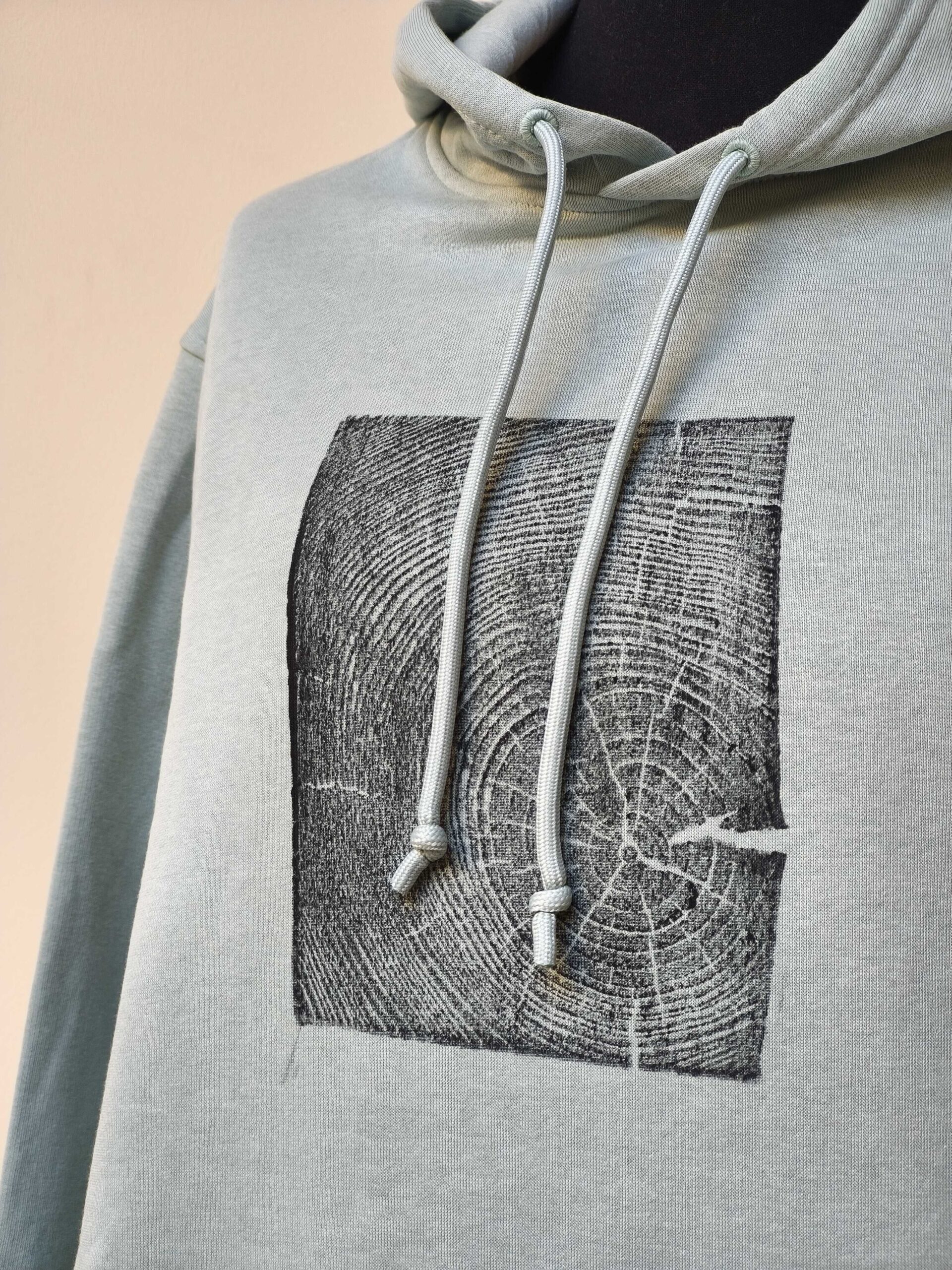 Kézzel-szívvel  és vízbázisú szitanyomással készült valódi gerenda lenyomat biopamut pulóveren.